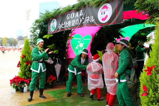 昼前には、私たちの作成したみどりと赤のOne Greenハートリースをキッズサンタ大使と西田ひかるさんが、トンネルにかけていただくセレモニーも行なわれ、代表である大阪大学名誉教授小林昭雄先生と記念撮影もさせていただき、集まられた多くの人に喜んでいただけました。