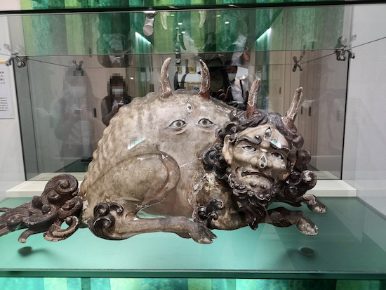 そして以前何かで見かけたことのある「白沢」の展示もあった。「白沢」とは古代中国の想像上の神獣で病魔を防いでくれるとのこと。説明を聞かれている参加者から「顔を並べて写真を撮りましょうか?」とお声掛けいただいたが、さすがに修学旅行のようなわけにはいかないので自重した。確かにとても失礼ではあるが髭と髪型は近いところがあるかもと感じた。