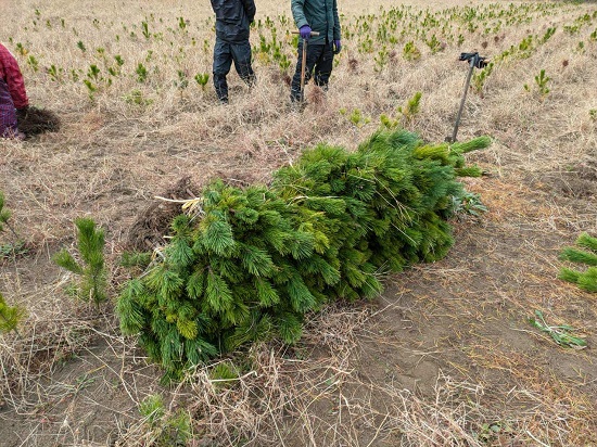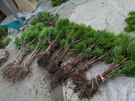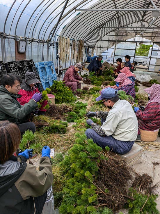 まずは行き先ごとに振り分けた畑より、健康で良い形に育った松を選んで、木の根元にスコップを入れる担当、引き抜き土を払う担当などに分かれて各人が手際よく進めていく。