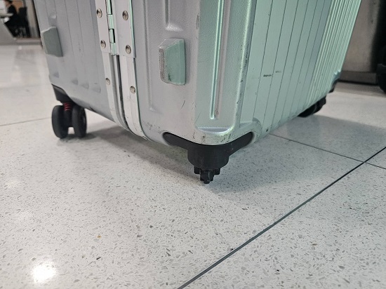 そして無事に入国審査を終えてターンテーブルでスーツケースをピックアップし、出口に向かおうとした時、うまく稼働せずつまずいてしまったので、おかしいなと思ってスーツケースを見てみるとコマが一つ取れてしまっていた。
