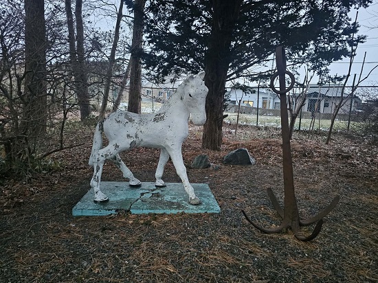 境内にはお祀りされているものかはわからないが、当地の産業にかかわりの深い、碇と馬が飾られており、なるほどな~~と一人で納得をし参道の端を歩きながら、澄んだ空気を胸いっぱいに吸い込み、舞い散る小雪を肩におきながら、身も心も洗われた清々しい気持ちになれたことが、とてもありがたく感じ、とても良いお詣りができたと感じ入った。