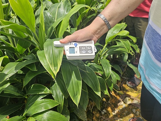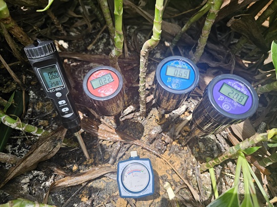 この農場では、さまざまな計測器でphやEC値、N・P・Kなど土壌に数値も測量し、植物自体の数値も計測しながら生産をしており、その数値に併せて施肥などを行うとのことである。