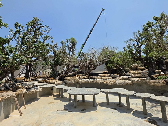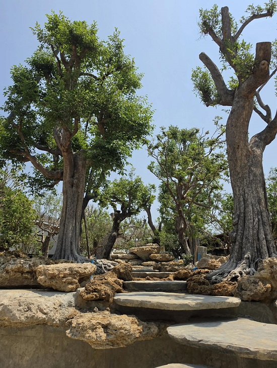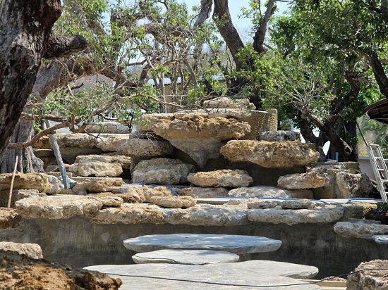 今はまだ完成していないため水は入っていなくてイメージしにくいかもであるが、冒頭の写真にあったように彼の作品は、特徴的な大きな樹木と石、動きのある水をうまく用いて、魅力的な世界観のガーデンを創り上げている。特に水の使い方は特徴がある。興味深いこともお聞きしたが、企業秘密かもなのでこのアップでは控えさせていただく。