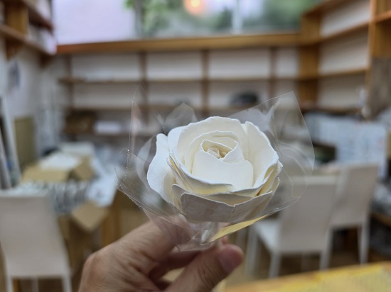 これは牛乳パックを再利用し作ったバラである。再利用のためまずは素地づくりにとても手間がかかっている。そこから写真のように丁寧に作りあげていく。とても根気のいる仕事である。ここではバラを紹介したが、他にもバッグなどつくられており、その精度の高さから今は納品まで順番待ちとのことである。
