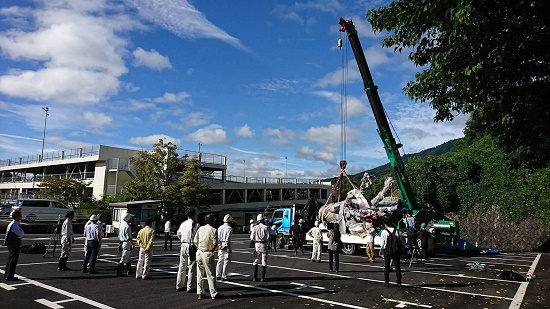 その後、固定のための地下支柱などを施し、安定したのを確認し、スリングとラッピングを外し、ほぼ作業を終えることができた。そして関係者など多くの人と記念写真を撮らせていただいた。